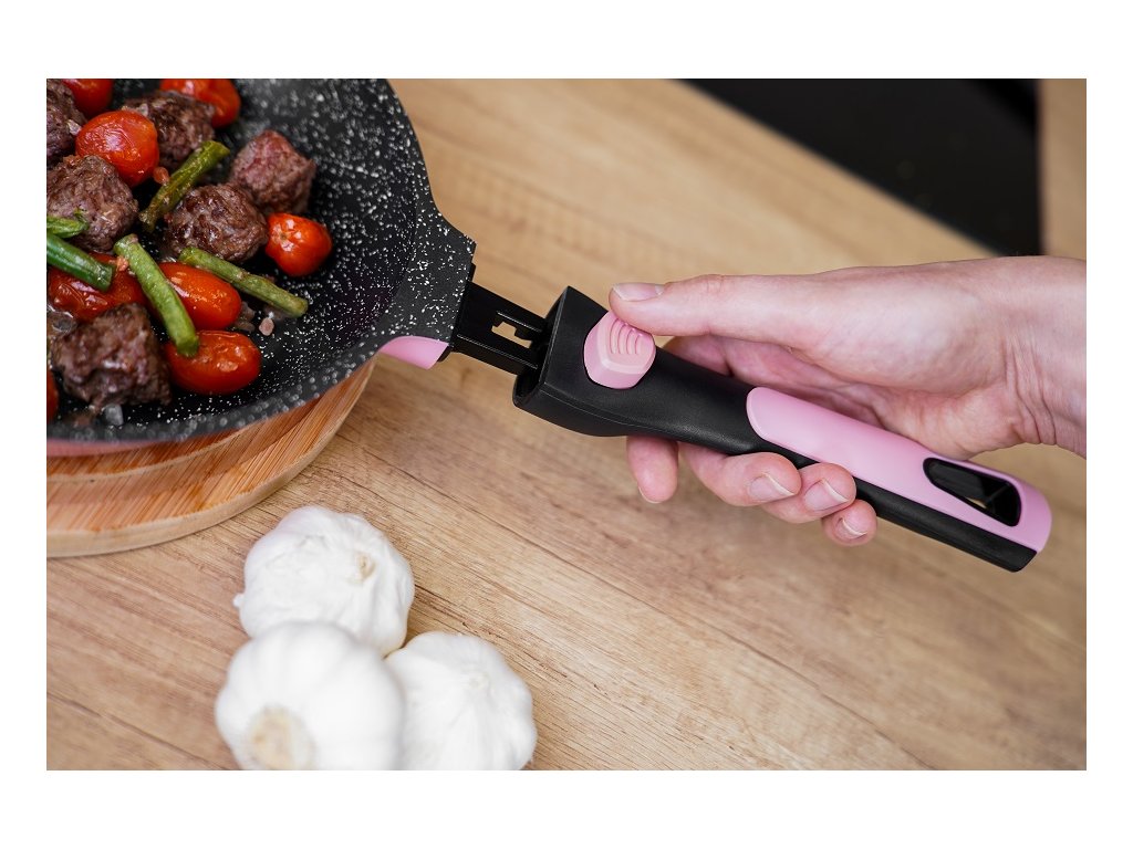 S CLICK systém lze rukojetí pánví a rendlíku odejmout a opět nacvaknout prostým stisknutím jednoho tlačítka. Pokrm lze tedy připravit na sporáku a dokončit v troubě. I hrnce jsou vhodné do trouby, a to dokonce i s poklicí, stačí je přemístit z trouby a do trouby pomocí silikonových madel v balení!