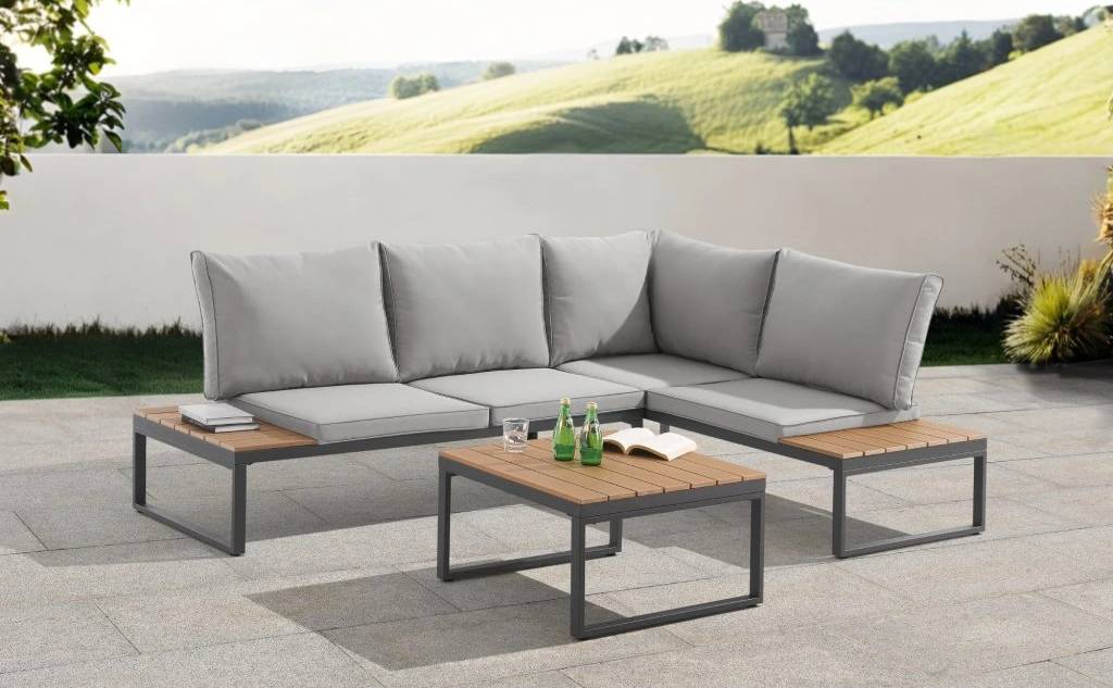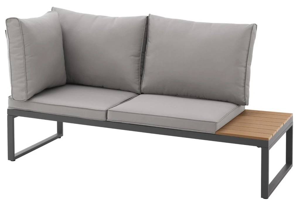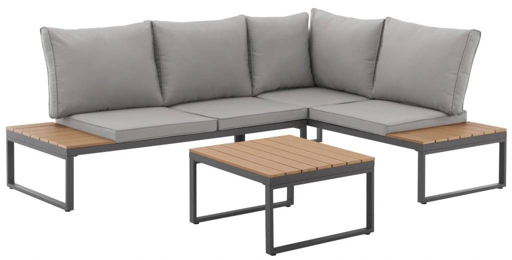 Stolek s dřevěným vzoremSoučástí je nízký konferenční stolek s deskou z polywoodu. Je ideální na nápoje, občerstvení nebo dekorace. TIP: Deska se snadno čistí a dodá soupravě elegantní vzhled.