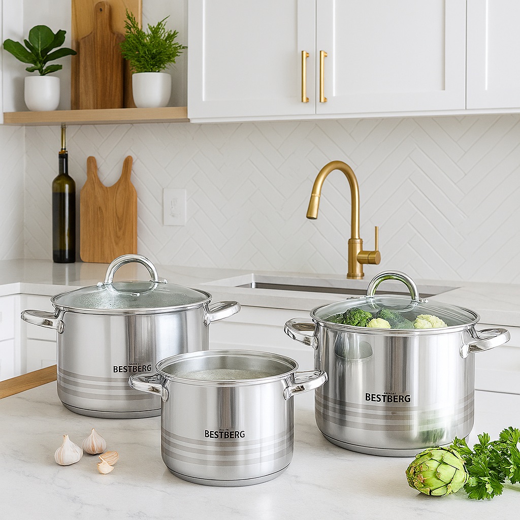 Vysoce kvalitní a odolná sada nádobí BestBerg BBSC-3STato sedmidílná sada hrnců je vyrobena z vysoce kvalitní nerezové oceli typu 201, která zaručuje výjimečnou odolnost a dlouhou životnost. Hrnce mají rovné stěny s tvarovaným a zesíleným okrajem, který usnadňuje nalévání a zvyšuje odolnost proti deformacím.
