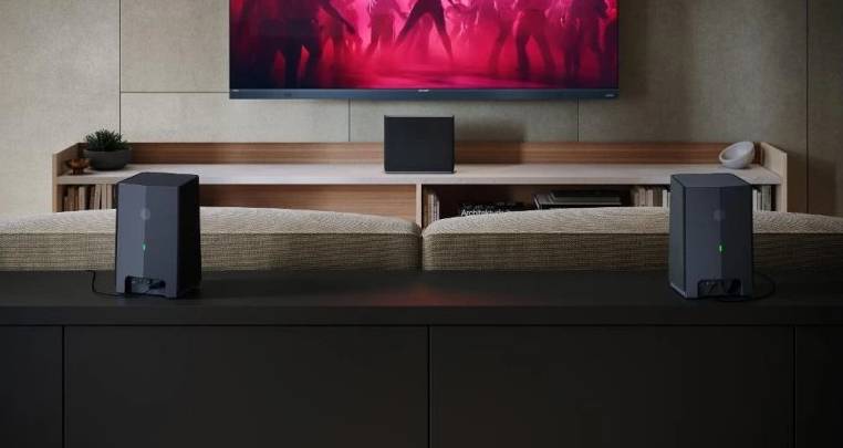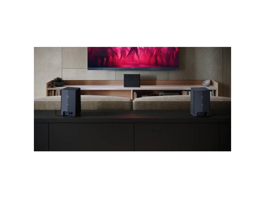 Reproduktory můžete umístit na stůl, připevnit na stěnu nebo je diskrétně schovat za nábytek. V nastavení televizoru lze přizpůsobit zvuk dle vlastních preferencí, včetně praktického nočního režimu, kdy je zvuk přehráván pouze přes zadní kanály. Navíc Bluetooth 5.3 umožňuje streamování zvuku i do jednoho reproduktoru – ideální pro rychlé přehrání hudby z mobilního zařízení.