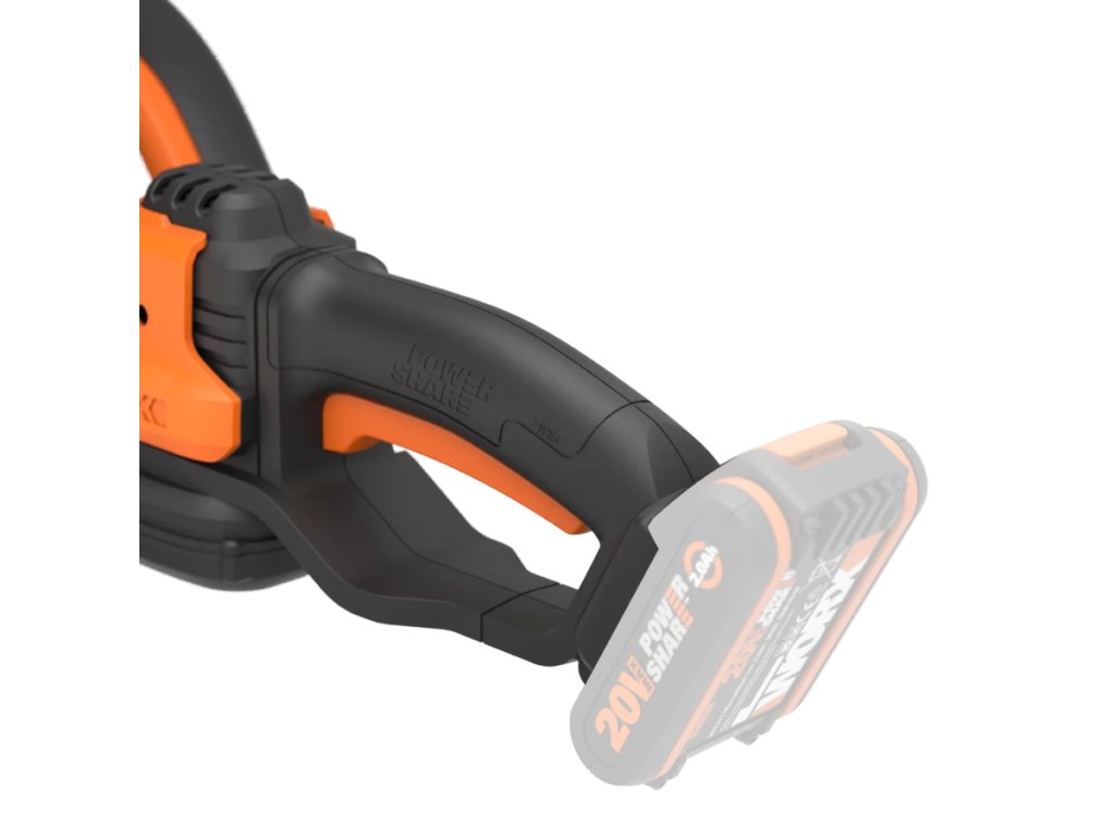 - AKU nůžky na živý plot Worx PowerShare WG261E.9 / 2200 ot./min. / délka řezu 45 cm / oranžová / BEZ AKUMULÁTORU A NABÍJEČKY