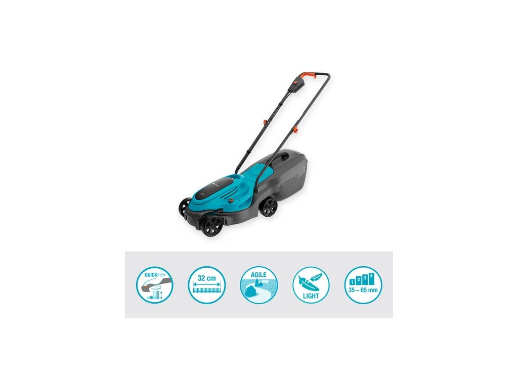 Jednostranně nabroušený nůž se šířkou záběru 32 cm zajišťuje čistý a rovnoměrný střih. Integrované hřebeny na trávu umožňují přesné sečení podél okrajů a zdí. Výkonný motor poskytuje konzistentní výkon a spolehlivé výsledky při každém použití.