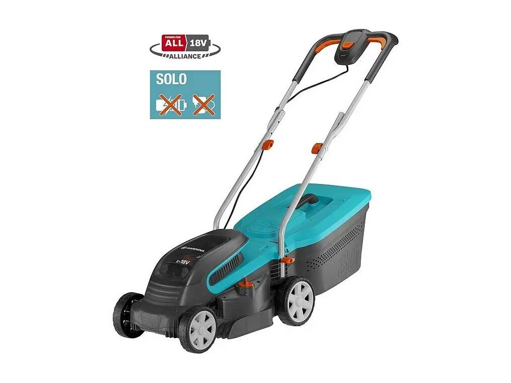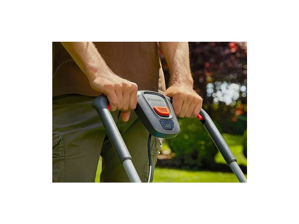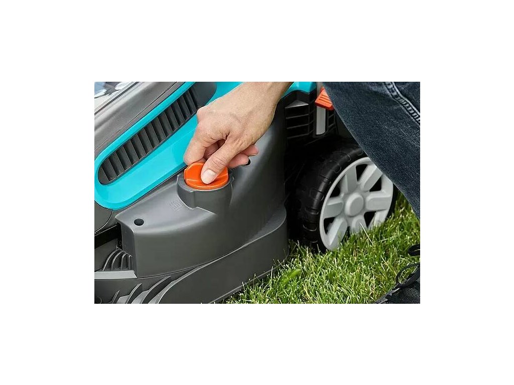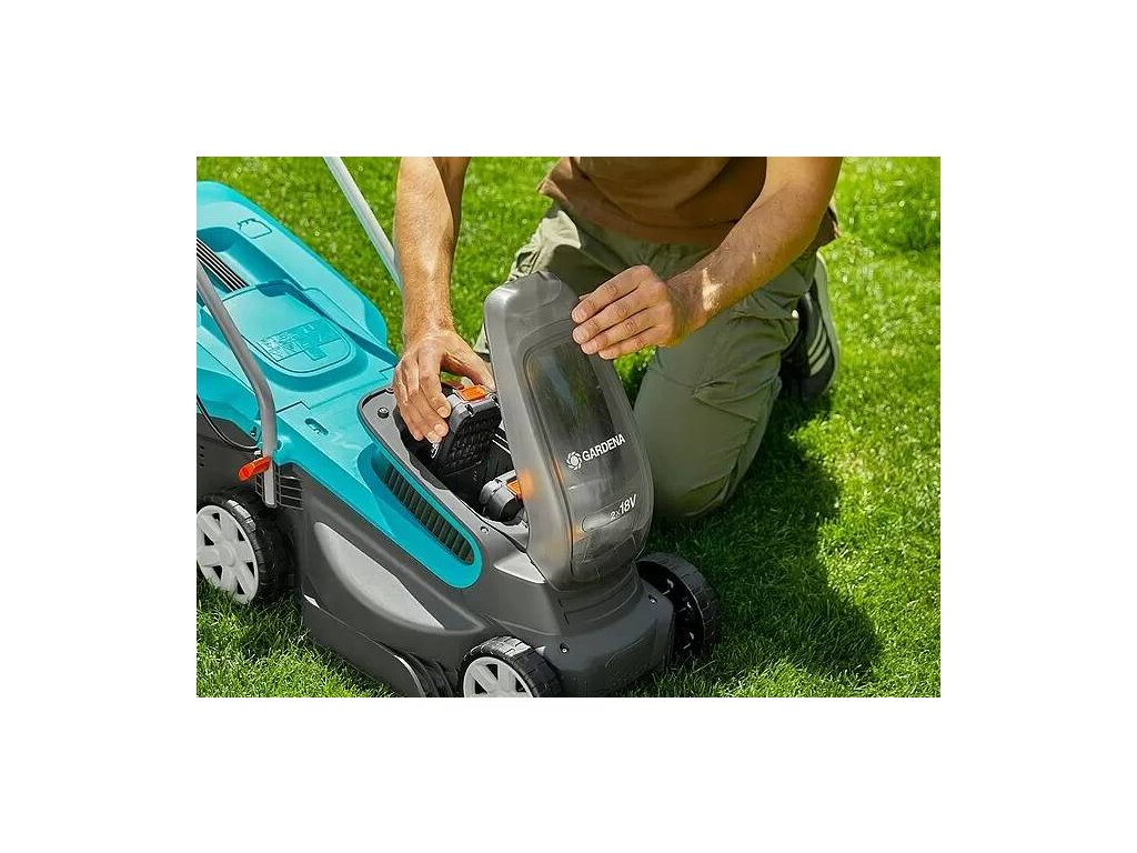 Obratná Gardena PowerMax 32/36V P4A (2 x 18V) s výkonným motorem PowerPlus je perfektní akumulátorová sekačka na trávu pro menší plochy. Pracovní šířka speciálně kalené čepele je 32 cm. Výšku sečení lze centrálně nastavit v deseti stupních pomocí QuickFit – stačí stisknout a otočit.