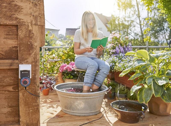 Automatické zavlažování květinových truhlíků od společnosti Gardena automaticky zavlažuje až šest metrů truhlíků na květiny. S vestavěným časovačem s 13 pevnými programy lze vaše truhlíky na květiny snadno zavlažovat i ve vaší nepřítomnosti. Pro nezávislost na vodovodním kohoutku lze zavlažování truhlíků na květiny provádět například přímo z nádrže na dešťovou vodu. Pokud má být spojeno více než šest metrů truhlíků na květiny, lze sadu prodloužit.