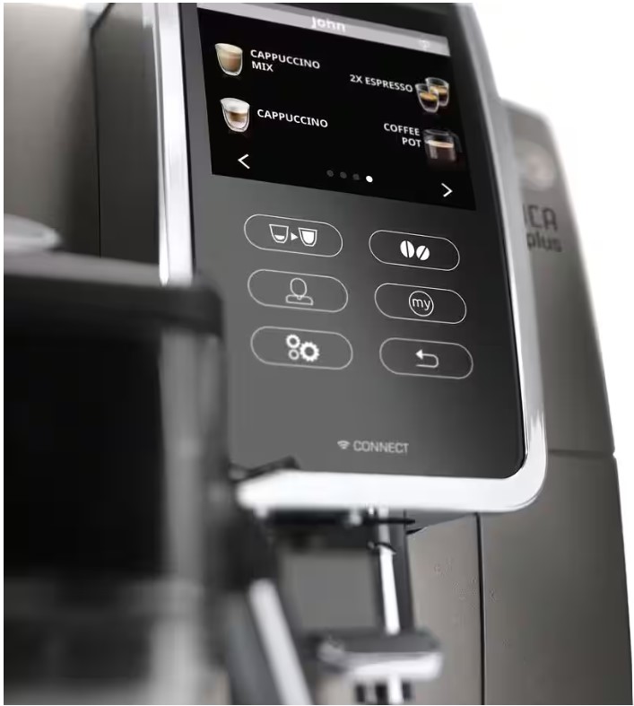 Díky 3,5" (8,9 cm) TFT dotykovému displeji a programovací funkci "My Coffee" je ovládání intuitivní a dětská hra. Díky velkému množství káv dostupných po stisknutí tlačítka si každý najde něco, s funkcí konvice na kávu - vy dokáže uvařit až 6 kávových nápojů pouhým stisknutím tlačítka Samozřejmě je také Dinamica Plus vybavena exkluzivním systémem LatteCrema DeLonghi pro dokonalou mléčnou pěnu až do posledního doušku.