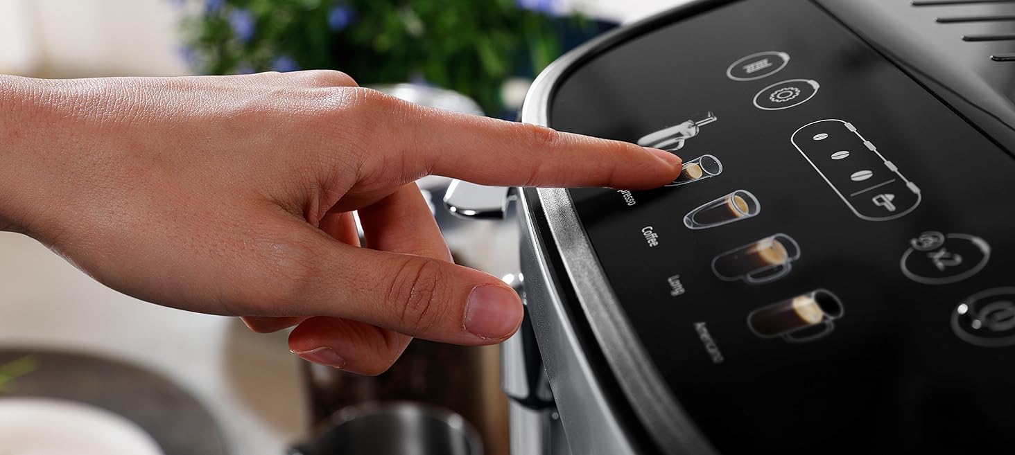 Objevte intuitivní rozhraní a funkce tohoto kávovaru s pěti vyhrazenými barevnými ikonami nápojů, které vám umožní přístup k vašemu oblíbenému nápoji jediným klepnutím. Tento model umožňuje přípravu espressa, běžné černé kávy, receptu MyLatte, cappuccina a horké vody na šálek čaje. Kromě toho si můžete nápoje přizpůsobit - vyberte si silné, střední nebo jemné aroma. Užijte si horkou, střední nebo nízkou teplotu.