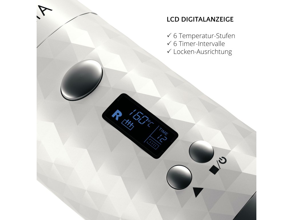 Kulma nabízí 6 úrovní teplot od 150 °C do 200 °C a stejný počet časových režimů, takže si přizpůsobíte styling podle svého typu vlasů i požadovaného efektu. Keramický povlak s titanovými destičkami chrání vlasy a umožňuje hladké natočení, navíc si můžete zvolit směr natáčení – doprava nebo doleva.