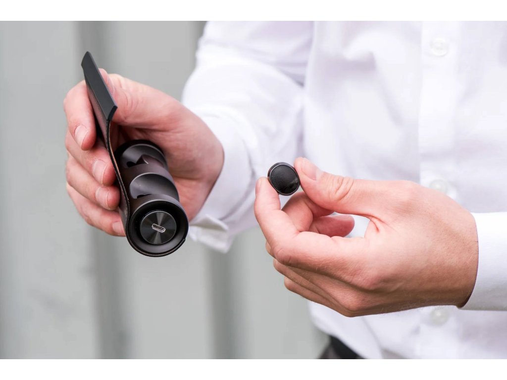 Nabíjecí pouzdro, které používáte k nabíjení náušníků, je potaženo kůží. To mu dodává luxusní vzhled. Indikátor nabíjecího pouzdra ukazuje, kolik energie sluchátka ještě mají. Pokud po cca 4 hodinách dojde energie (plně nabitá), připojte nabíjecí pouzdro k počítači nebo k elektrické síti pomocí dodaného USB kabelu a zástrčky. To vám umožní nabíjet sluchátka rychle.