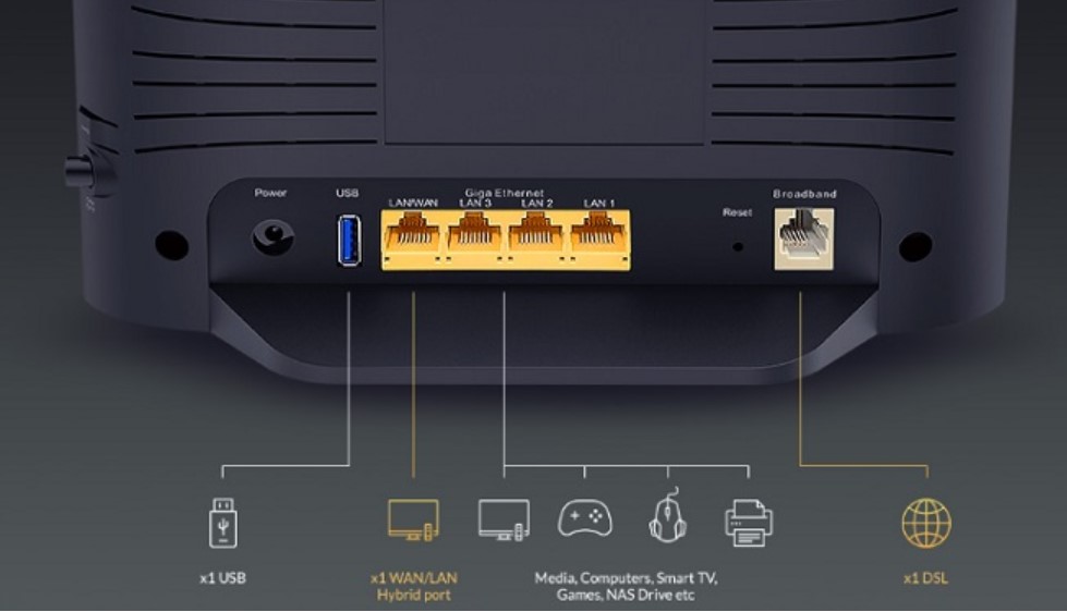 Integrovaný port pro připojení DSL signálu, gigabitové LAN porty pro chytrou televizi, úložiště (NAS), konzoli nebo další media a také USB port pro sdílení souborů, fotografií nebo videí.