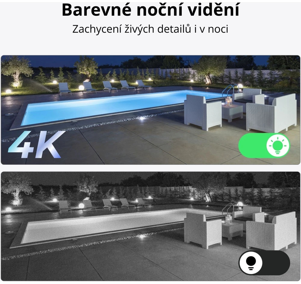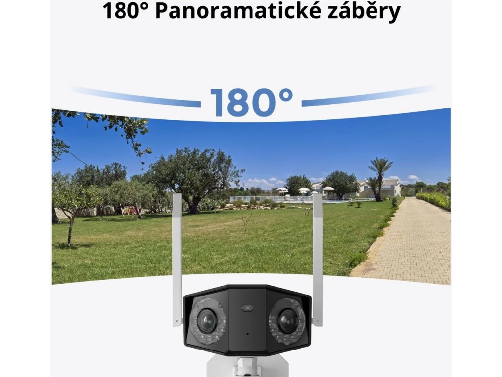 Duální čočky spojují dva obrazy v jeden dokonalý panoramatický snímek bez rušivých okrajů. S vysokým 8MP rozlišením uvidíte každý detail s maximální ostrostí – ve dne i v noci. Infračervené vidění a silné LED reflektory vám zajistí čisté, barevné záběry i v hluboké tmě.