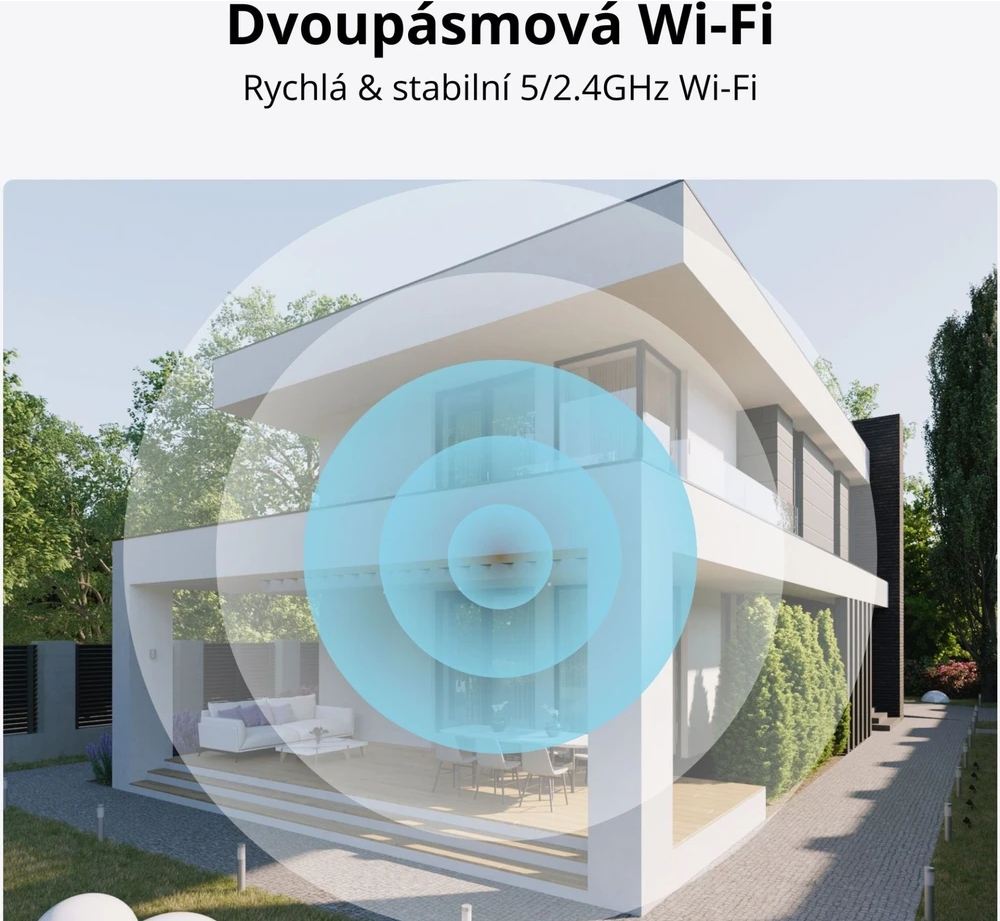 Díky podpoře 2,4 i 5 GHz Wi-Fi je kamera zcela bezdrátová a snadno ji umístíte na ideální místo v dosahu sítě. Instalace je rychlá a zvládne ji každý – stačí pár minut a kamera je připravena hlídat.