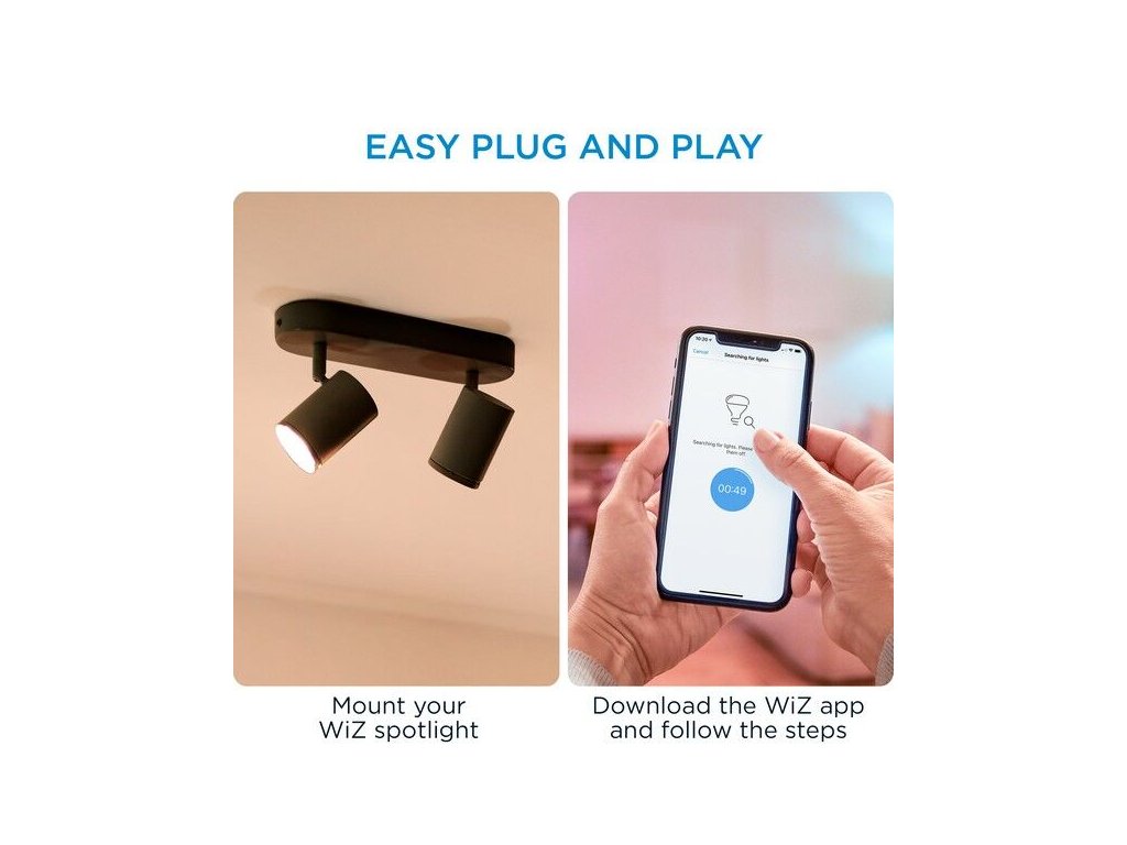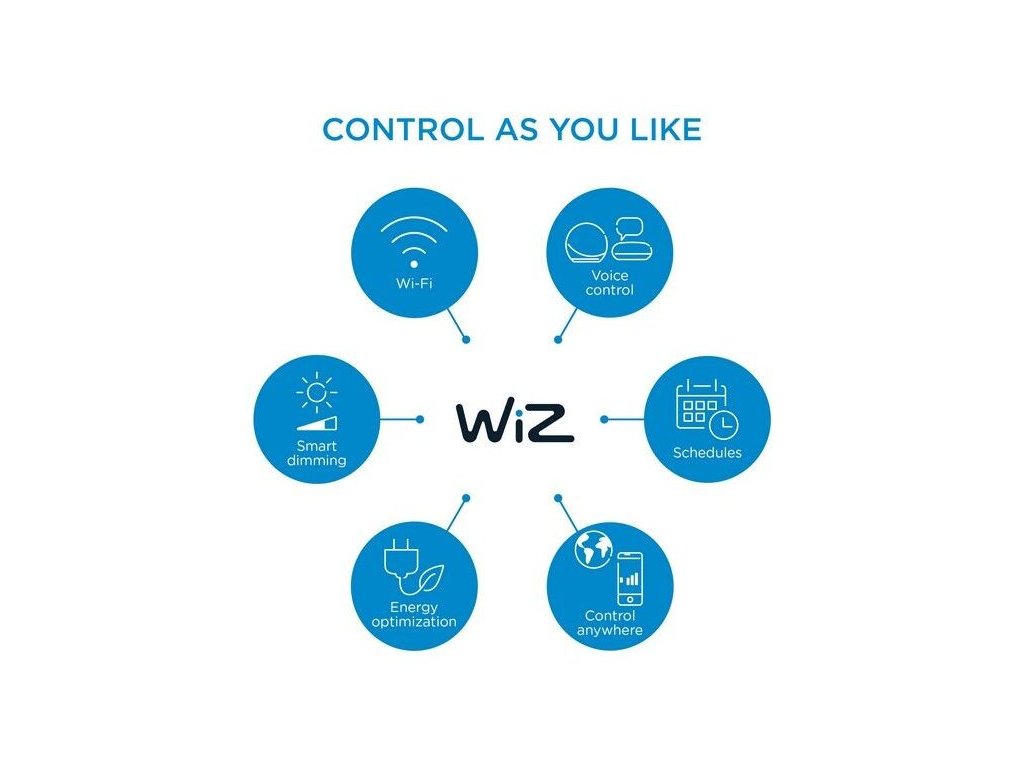 WiZ se připojuje přímo do vaší Wi-Fi sítě a není potřeba žádné další zařízení. Stačí instalovat svítidlo, stáhnout aplikaci WiZ či technologii Bluetooth a máte hotovo.