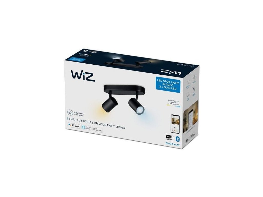 Svítidlo IMAGEO je zhotoveno z kvalitního kovu s černou povrchovou úpravou. Svítidlo IMAGEO je osazeno paticí GU10 a dodává se spolu s inteligentní LED žárovkou WiZ o příkonu 2 x 5W se svítivostí až 700lm a nastavitelnou teplotou chromatičnosti od 2700K (teplé žluté světlo) do 6500K (studené bílé). Díky ochraně IP20 není určeno do koupelny nebo vlhkého prostředí.