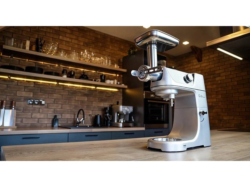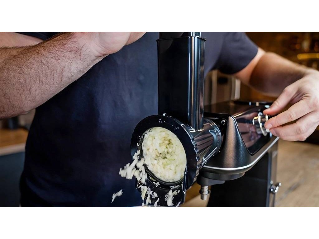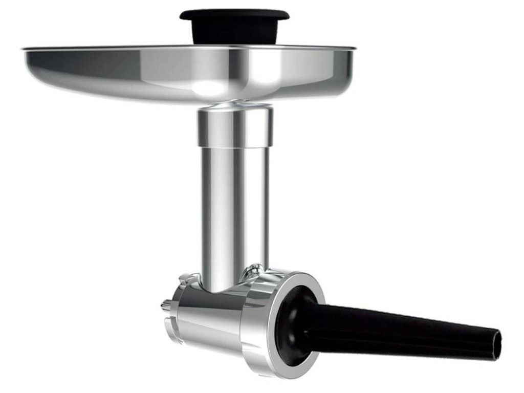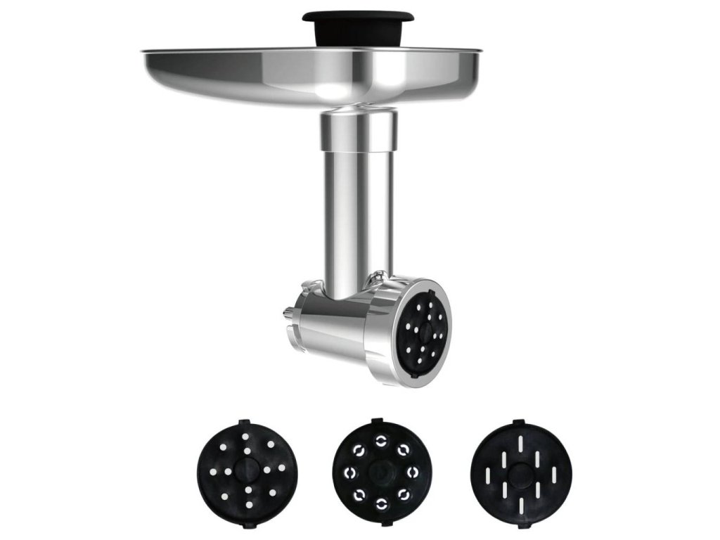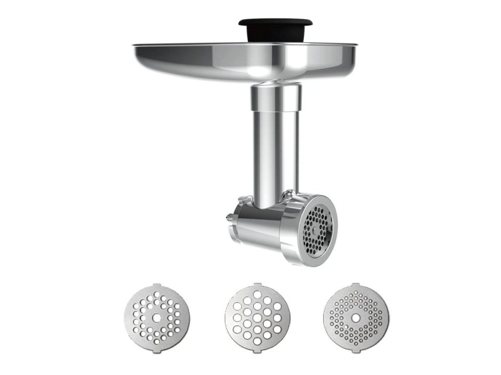 Součástí výbavy je robustní mlýnek na maso z hliníku, který zvládne mleté maso, paštiky i zeleninové směsi. K dispozici jsou tři výměnné mřížky s různou hrubostí mletí – jemná, střední a hrubá. Mlýnek lze rozšířit o nástavec na výrobu klobás nebo tradiční Kubbe kotouč, díky kterým připravíte domácí speciality přesně podle svých představ.