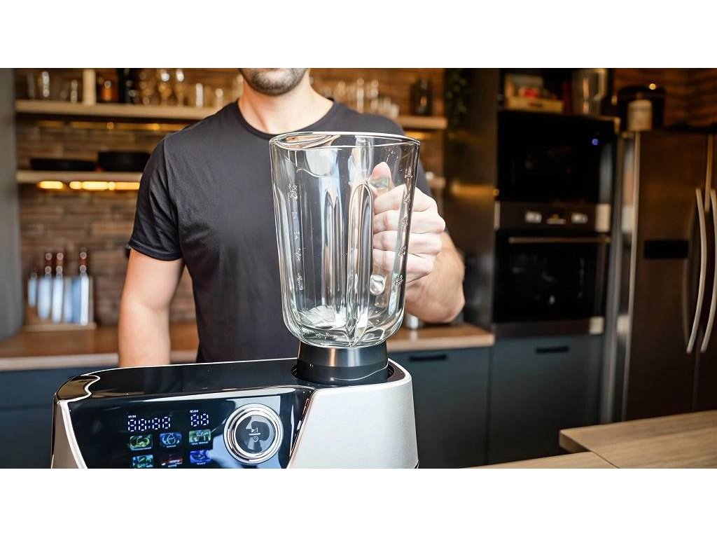 Robot doplňuje skleněná mixovací nádoba o objemu 1,5 litru, která je ideální pro přípravu smoothie, polévek, koktejlů i omáček. Nádoba je opatřena víkem s odměrkou a pěchovadlem pro bezpečné plnění během mixování, takže máte vše pod kontrolou. Silný motor se postará o hladkou konzistenci bez hrudek.