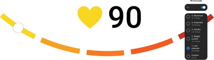 Vaše hodinky dokážou díky agregaci dat odhadnout vaši fyzickou kondici a určit osobní tréninkový prostor jménem HR Zone. Vždy, když se budete chtít zaměřit na určitou část svého těla nebo typ cvičení (například spálení tuku, kardio či trénink o vysoké intenzitě), si jednoduše manuálně nastavíte cíl, a v okamžiku, kdy se do jeho zóny dostanete, vás zařízení upozorní. Rovněž budete vědět, když ze zóny zase vyskočíte, což umožní lepší přehled nad vynaloženým úsilím.