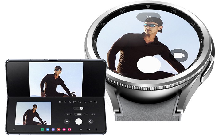 Spárujte hodinky s chytrým telefonem Galaxy Z Fold5 nebo dalšími moderními smartphony Galaxy a zachyťte své zdravější já zblízka i z dálky. Režim Flex a aplikace Ovladač fotoaparátu vám umožní pohodlně přepínat mezi pořizováním fotografií a videí, přiblížit či oddálit záběr – to vše z vašeho zápěstí. Poté jednoduše klepněte na tlačítko závěrky a pořiďte snímek.