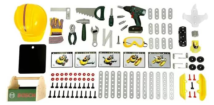 - Sada dále obsahuje helmu, ochranné brýle, rukavice, chrániče sluchu, šroubováky, kladiva, kleště, pilu, úhelník, měřítka, svěrák, šrouby, matice, lišty či mnoho dalšího ...