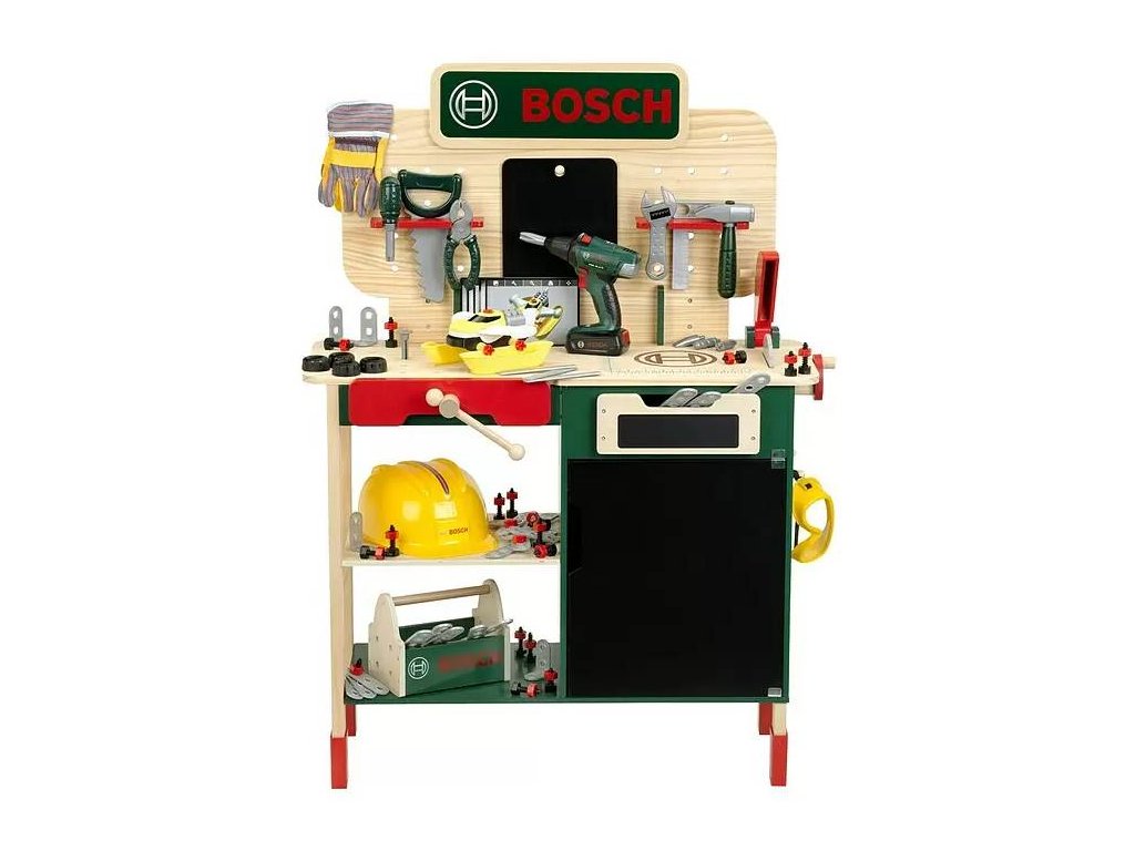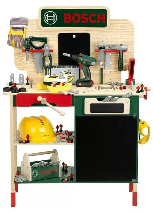 Dětský výškově nastavitelný pracovní stůl Klein Bosch 8734 je vyroben z vysoce kvalitního borovicového dřeva. Pracovní plocha nabízí mnoho příležitostí k učení a praktické úložné prostory pro akumulátorový šroubovák Bosch a parádní mechanickou okružní pilu se, která vydává zvukové efekty.