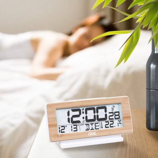Digitální radiobudík ADE CK1940 s LCD displejem, o rozměrech 12,8 x 4,4 cm, který lze vypnout stisknutím tlačítka. Budík má velmi velké tlačítko odložení, což je velmi pohodlné. Kromě času hodiny zobrazují teplotu v místnosti (°C/°F) a také datum a den v 7 dostupných jazycích. Časový signál z hodin je přijímán přes DCF, takže změna letního a zimního času je automatická a nemusíte na nic myslet.