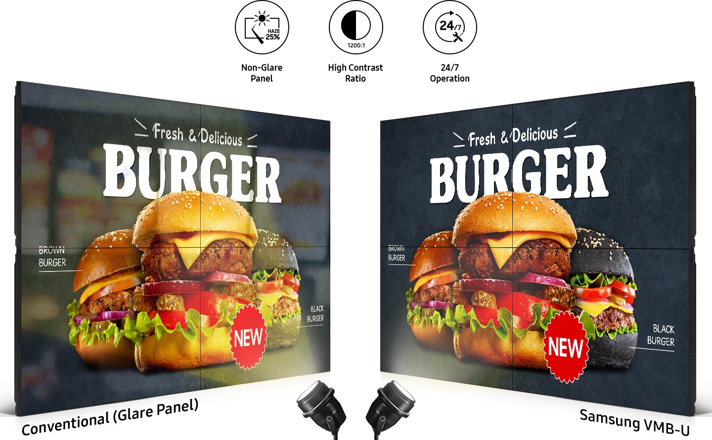 Upoutejte pozornost svých zákazníků hned na první pohled s pohlcujícím displejem ze série Samsung VMB-U, který nabízí spolehlivý nepřetržitý provoz 24 hodin denně, 7 dní v týdnu. Jeho štíhlý design s minimální hloubkou a velmi tenkým rámečkem poskytuje prostorově efektivní řešení ideální do prodejen, zasedacích či kontrolních místností, kde dokonale zobrazí veškerý váš obsah. Jas 500 nitů zajistí vynikající obraz i v prostředí s intenzivním osvětlením, například v nákupních centrech nebo blízko oken.