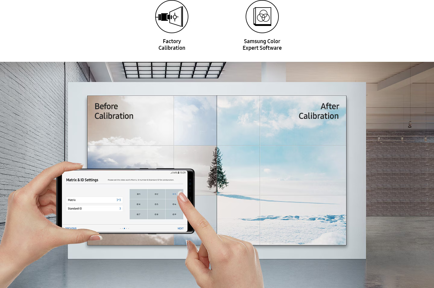 Víceúrovňové tovární nastavení zajišťuje jednotný jas a věrné barvy napříč displeji. Uživatelé pak mohou jednotlivé parametry přizpůsobit pomocí bezplatného a výkonného softwaru Color Expert Pro. Pro rychlou a snadnou kalibraci displejů až do velikosti 3x3 lze navíc využít fotoaparát mobilního telefonu spolu s aplikací Color Expert Pro Mobile, kterou si stačí stáhnout.