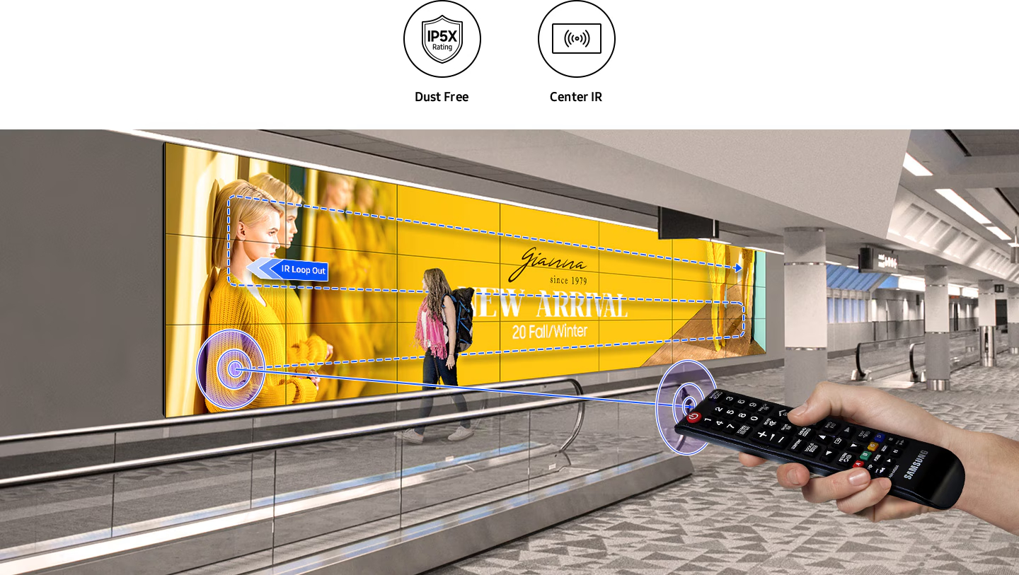 Řada VMB-U je navržena tak, aby odolala různým nepříznivým podmínkám a vlivům prostředí. Díky standardu odolnosti proti prachu IP5x lze displej bezpečně umístit i do prašných prostor bez nutnosti další ochrany. Vestavěný centrálně umístěný infračervený přijímač (IR) pak zajišťuje uživatelům pohodlné a flexibilní ovládání zařízení.
