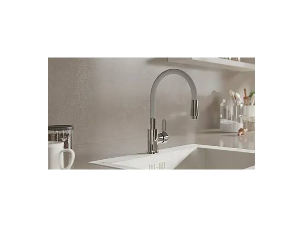 Dřezová baterie Camargue Flexo je navržena tak, aby maximálně usnadnila každodenní práci v kuchyni. Pružný výtok otočný o 360° umožňuje snadnou manipulaci i s velkými hrnci a nádobím, zatímco měkký povrch výtoku zajišťuje pohodlné a přesné směrování proudu vody přesně tam, kde jej potřebujete.