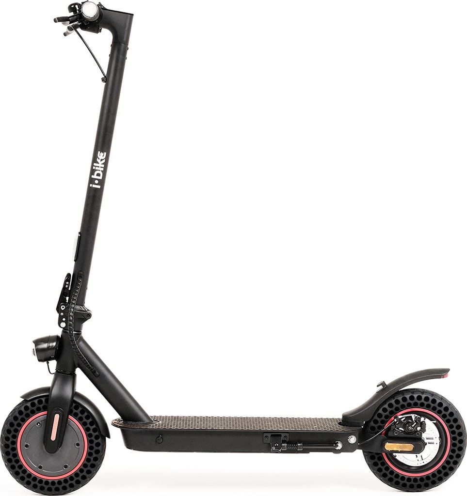 Černá koloběžka I-Bike se skládá z hliníkového rámu, dvou nezávislých brzdových pák: přední elektrické a zadní kotoučové, předních a zadních LED světel a směrových šipek.