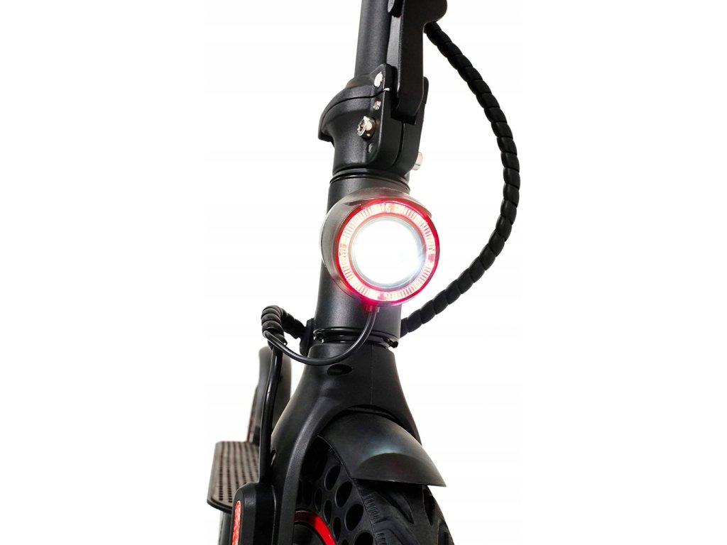 Černá koloběžka I-Bike se skládá z hliníkového rámu, dvou nezávislých brzdových pák: přední elektrické a zadní kotoučové, předních a zadních LED světel a směrových šipek.