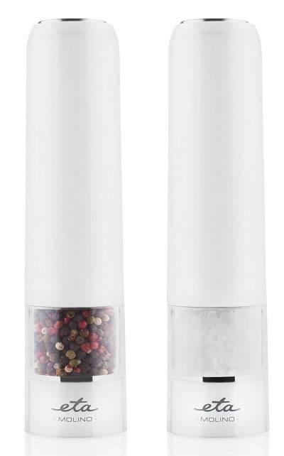 - Elektrický mlýnek na sůl a pepř ETA Molino 0928 90000 / 2 ks / 6x AAA baterie / keramický mlecí mechanismus / osvětlení / nastavitelná hrubost mletí / bílá