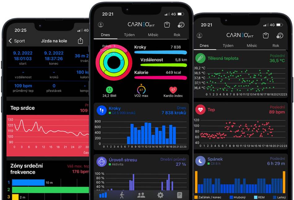 Mobilní aplikace Carneo Fit, ukrývá nespočet jedinečných funkcí. Propojte svůj chytrý telefon s hodinkami a sledujte možné funkce fitness hodinek.