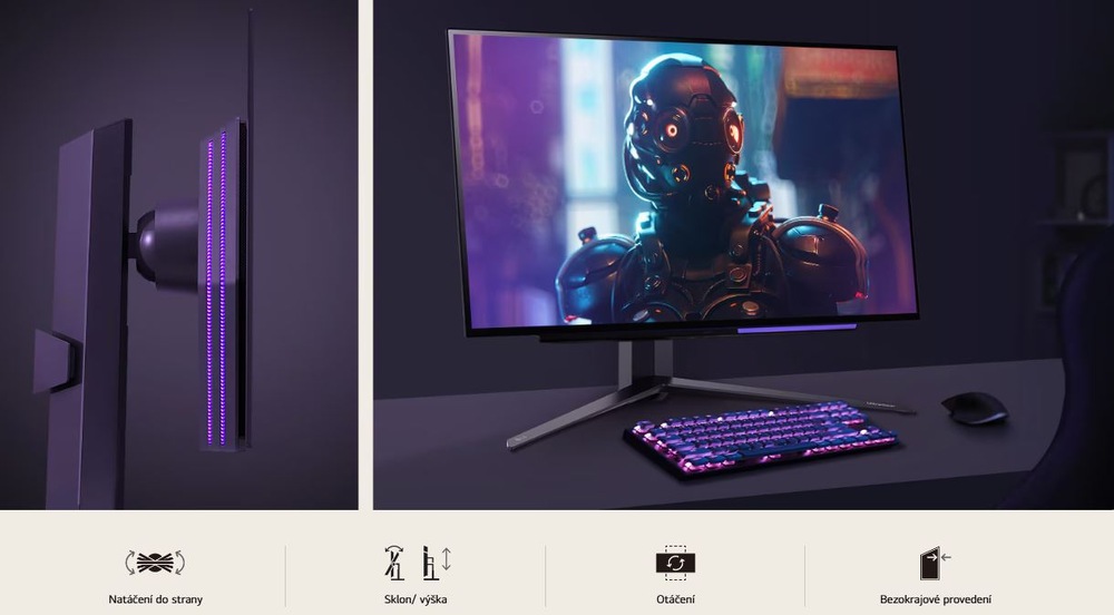 Herní monitor LG 27GS95QE-B nabízí maximální komfort díky nastavitelné poloze. Základna podporuje otáčení, naklápění a nastavení na výšku. Za zmínku stojí i atraktivní téměř bezrámečkový design.