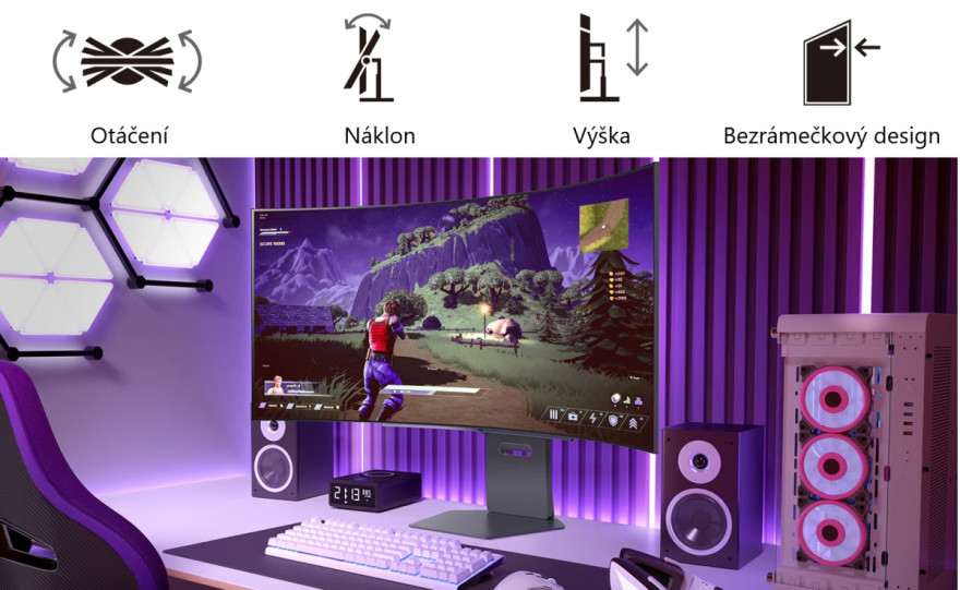 Průhledný stojan ve tvaru L a štíhlý profil šetří místo na stole a vytvářejí čisté pracovní prostředí. Monitor nabízí šestiúhelníkové osvětlení, téměř bezrámečkový čtyřstranný design a plně nastavitelné možnosti – otáčení, naklápění, nastavení výšky a rotace – pro maximální pohodlí a flexibilitu.