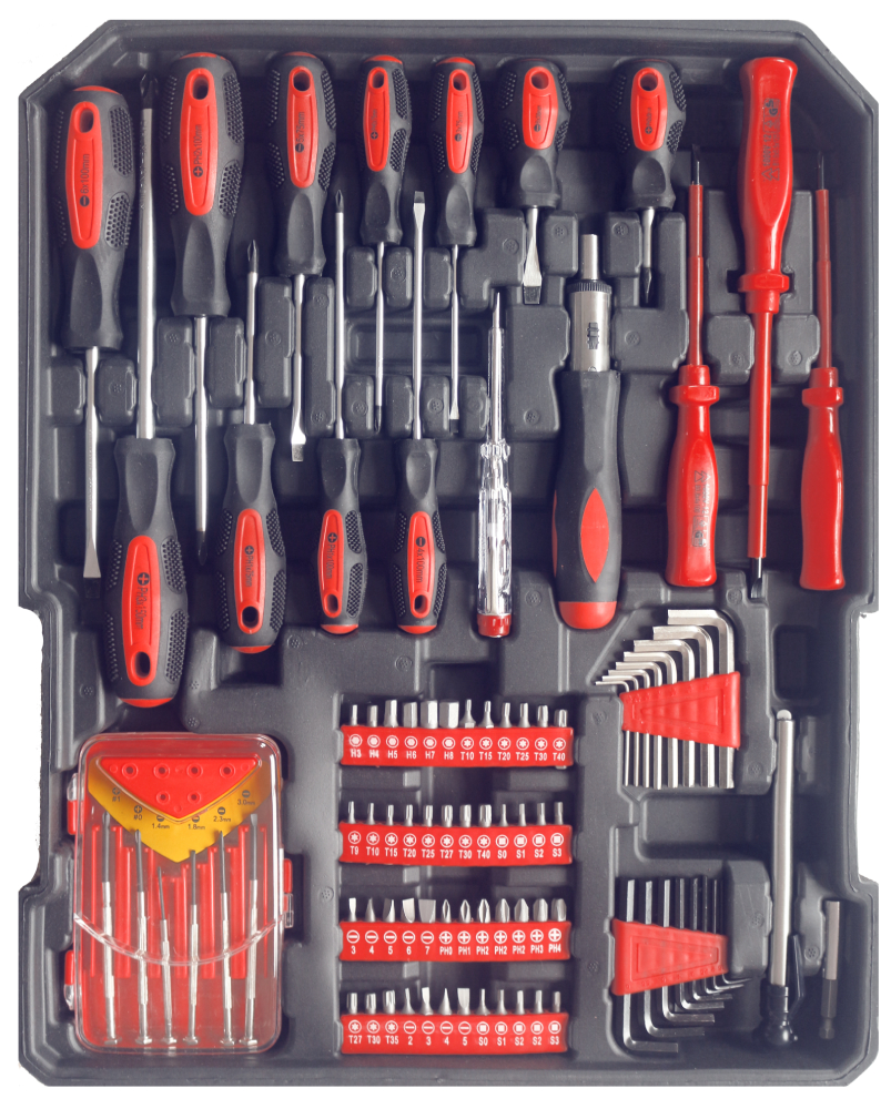 Tento set je perfektní pro každého, kdo potřebuje kompletní a spolehlivou sadu nástrojů pro šroubování a elektrické práce. Různé velikosti křížových a plochých šroubováků pro širokou škálu aplikací. 2 ploché a 1 křížový elektro šroubovák s izolací je bezpečný pro práci s elektrickými zařízeními. Ráčna pro šroubování umožňuje rychlé a efektivní šroubování s minimální námahou. Elektro zkoušečka napětí je nezbytný nástroj pro kontrolu napětí a bezpečnost při práci s elektřinou. Měřič tlaku pneumatik je praktický nástroj pro kontrolu tlaku v pneumatikách, zajišťující bezpečnou jízdu. Navíc je zde široká škála bitů pro různé typy šroubů. Prodlužovací nástavec na bity umožňuje snadný přístup k těžko dostupným šroubům. Různé velikosti imbusových klíčů pro práci s imbusovými šrouby, ideální pro montáž nábytku a další úkoly. Hodinářské šroubováky jsou precizní nástroje pro jemné práce, jako je oprava hodinek nebo elektroniky.