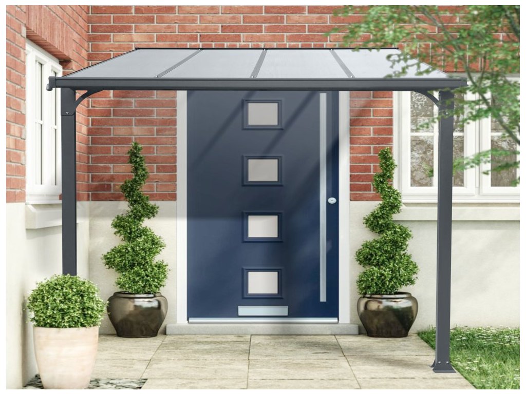 Moderní design s antracitovou práškovou barvou dodává vašemu domu elegantní a stylový vzhled. Tato pergola se snadno integruje do různých architektonických stylů a zvyšuje celkovou estetiku vašeho domova. Je to skvělý způsob, jak vylepšit první dojem, který váš dům zanechává. Díky ochraně před přímým vystavením povětrnostním vlivům výrazně prodlužuje životnost vašich dveří. Snížením opotřebení a poškození způsobeného deštěm, sněhem nebo sluncem, přístřešek pomáhá udržet vaše dveře v dobrém stavu po delší dobu.
