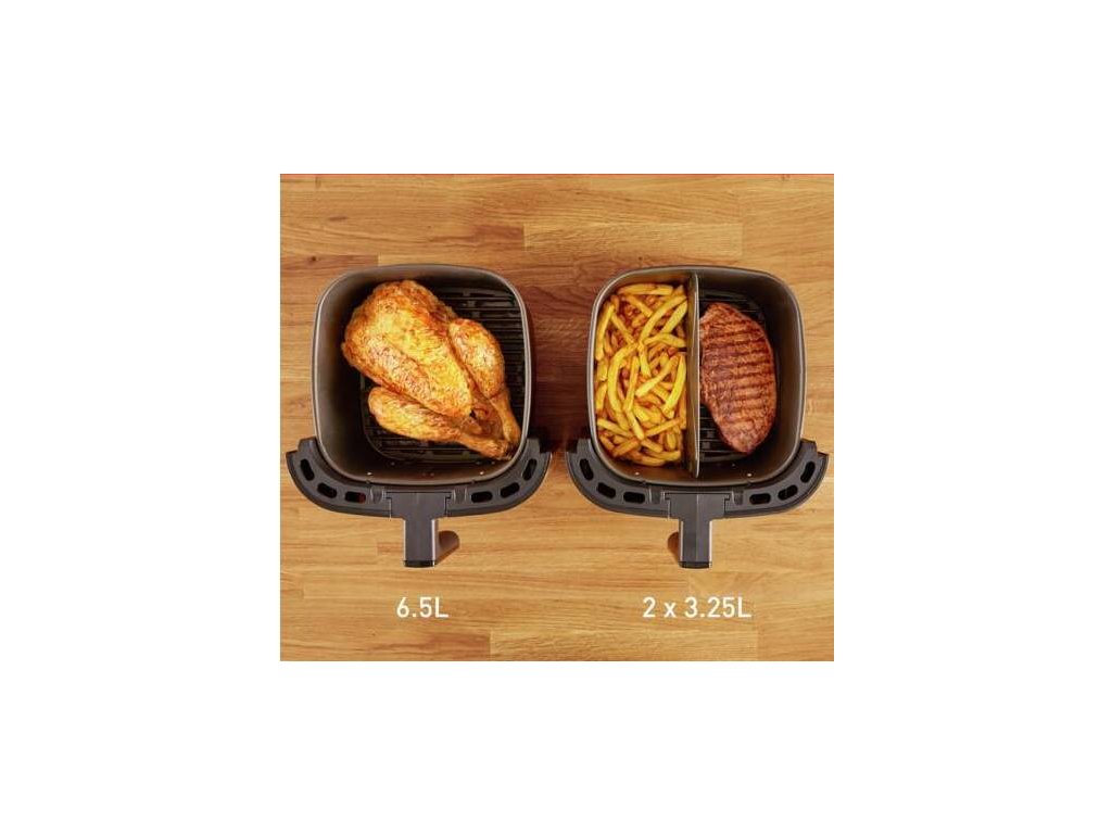 Připravte pro celou rodinu lahodné a přitom zdravé pokrmy s kombinací horkovzdušné fritézy a grilu 2 v 1. Díky celkové kapacitě 6,5 litru/2 kg zvládne připravit jídlo až pro 8 osob – včetně dvou pokrmů současně vzhledem k vyjímatelnému oddělovači Flexcook. Navíc je dokáže připravit ve stejný čas zásluhou režimu Intelligent Synchronization.