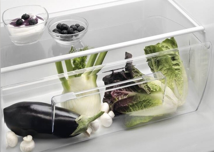 Transparentní zásuvka na čerstvé ovoce a zeleninu pojme i větší kusy potravin.