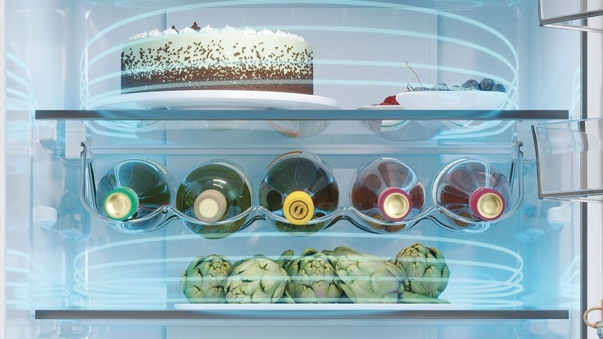 Systém Air Surround se stará o perfektní cirkulaci vzduchu v chladničce prostřednictvím ventilátoru, jenž studený vzduch distribuuje do celého prostoru. Konstantní teplotu pak pomáhají udržovat elektronická čidla, aby potraviny vydržely déle čerstvé a plné vitamínů. Technologie Total No Frost zamezuje tvorbě námrazy, což má pozitivní vliv na spotřebu a také to znamená méně starostí s údržbou. Současně díky rovnoměrnému chlazení vydrží potraviny déle chutné a čerstvé.
