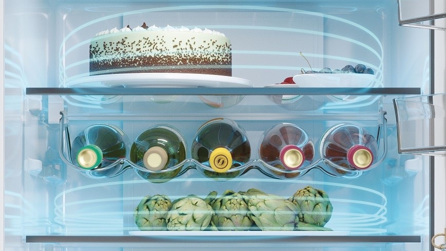 Systém Air Surround se stará o perfektní cirkulaci vzduchu v chladničce prostřednictvím ventilátoru, jenž studený vzduch distribuuje do celého prostoru. Konstantní teplotu pak pomáhají udržovat elektronická čidla, aby potraviny vydržely déle čerstvé a plné vitamínů.