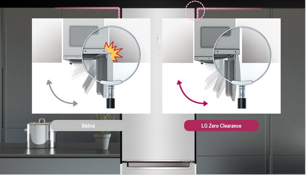 Jednou za čas budete určitě potřebovat suroviny, které jste uskladnili do zadní části zásuvky. S tím vám pomůže LG Zero Clearance, díky kterému můžete při otevření dveří v úhlu 90° zásuvky plně vysunout. Navíc dveře nebudou přesahovat přes tělo chladničky.