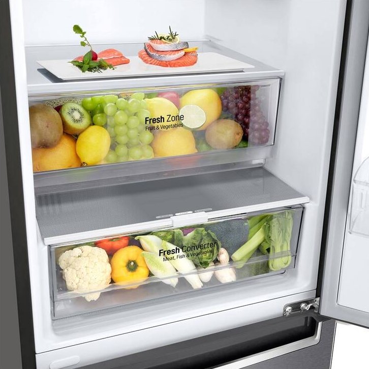 Je tvořeno 3 policemi z tvrzeného skla, držákem na vajíčka a 2 zásuvkami (Fresh Zone, Fresh Converter), hodící se k uskladnění především masa, ryb nebo zeleniny. Díky LED osvětlení uvidíte do každého koutku ledničky, ve které se v žádném případě nebude tvořit námraza. Spotřebič je totiž vybavený beznámrazovou technologií LG Total No Frost. Pokud se vyskytnou nějaké problémy, pomůže vám je vyřešit inteligentní diagnostika Smart Diagnosis™.