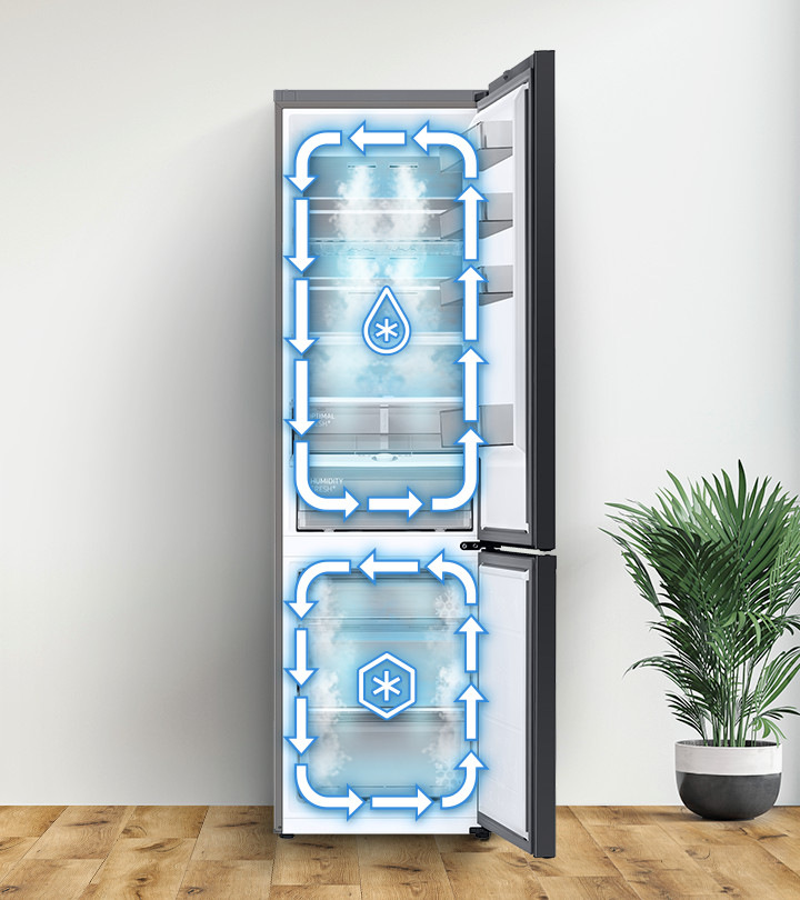 Dejte sbohem nepříjemnému mísení pachů. Díky sofistikovanému řešení nezávislého chlazení Twin Cooling bude v chladničce i mrazničce vzduch proudit v uzavřených okruzích, takže vaše uložené pochutiny zůstanou déle čerstvé a šťavnaté – bez toho, aby vzájemně přebírali své aroma. Systém praktických výparníků a ventilátorů pracuje tak, aby se každá položka uložená v policích chladila rovnoměrně a dostalo se jí péče v podobě kombinace optimální vlhkosti a chladu.