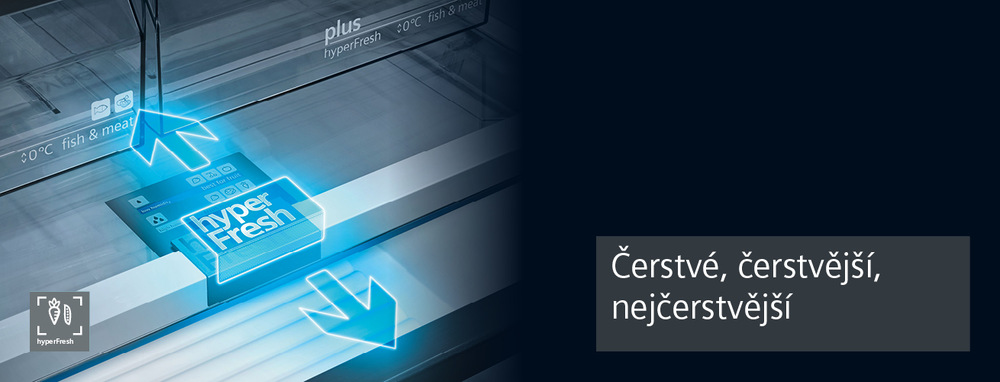 Přihrádky hyperFresh umožňují delší trvanlivost a zachování chutí pomocí snadného nastavení. Kromě toho jejich tvar i funkce jsou navrženy tak, aby poskytovaly vhodné prostředí pro ovoce a zeleninu. Jako výsledek můžete vidět kvalitu, cítit čerstvost a spolehnout se na dobrou chuť.