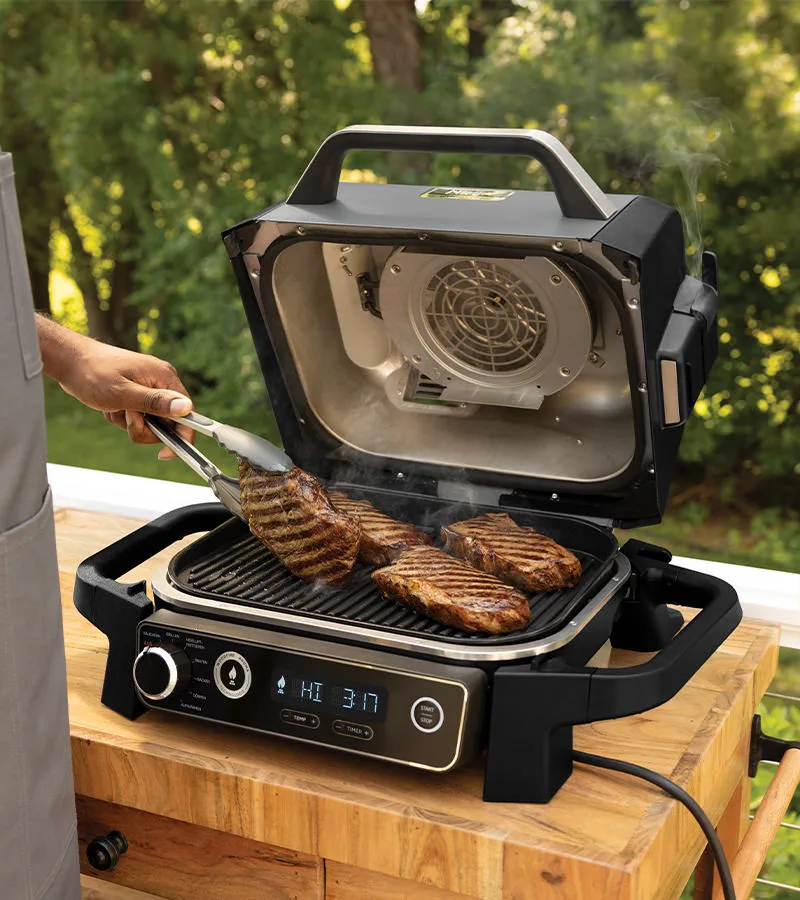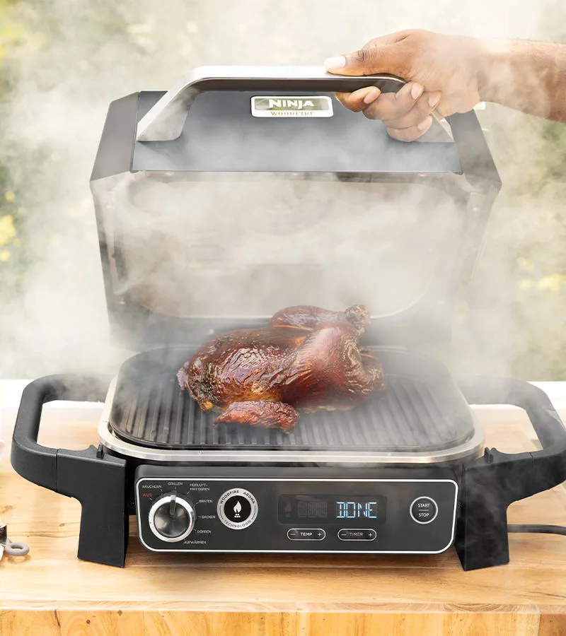 Celoroční venkovní vaření s elektrickým venkovním grilem a udírnou Ninja Woodfire. Grilování a uzení, smažení horkým vzduchem, pečení, zapékání a dokonce i sušení s přírodní chutí dřeva.