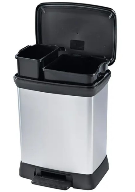 Odpadkový koš na tříděný odpad Keter Deco Bin Duo má dvě samostatné nádoby o objemu 18 a 10 l pro třídění odpadu. Svým tvarem se skvěle hodí do kuchyně, pokoje, koupelny nebo kanceláře. Pedálový mechanismus usnadní manipulaci s ním a těsně přilehající víko koše zadrží zápach. Koš je díky kvalitnímu materiálu vysoce odolný vůči nárazům.