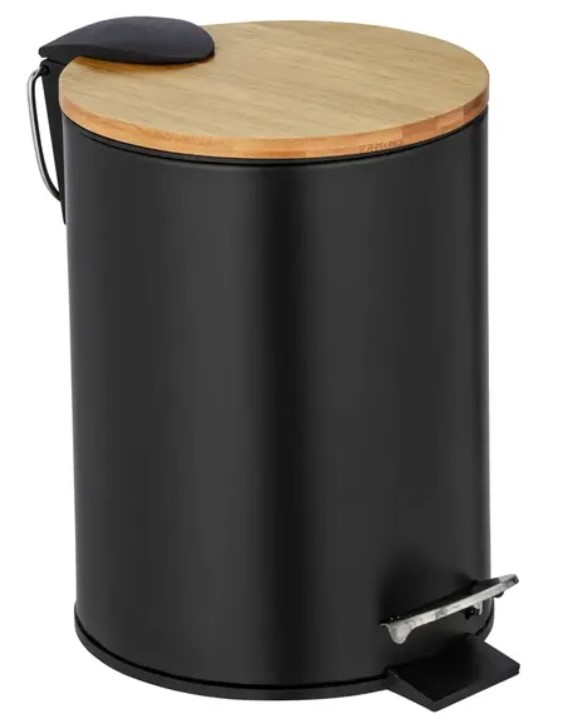 Kosmetický koš Tortona značky Wenko se vyznačuje jednoduchým zpracováním v černé barvě a dřevěných prvků. Je vybaven pedálem a funkcí softclose, která zajišťuje automatické, hladké a tiché dovření víka. Koš je vyroben z kovu a bambusu, má výšku 23,5 cm a průměr 17 cm.