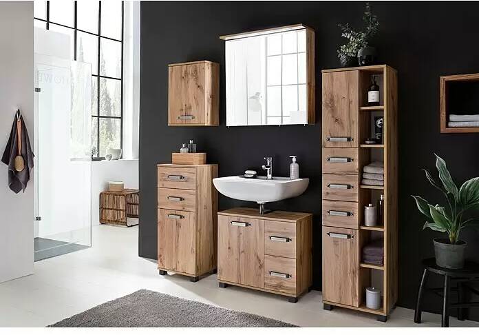 Spodní skříňka Milan od Schildmeyer nabízí spoustu úložného prostoru. Úchytky v antickém ocelovém provedení a hmatatelná struktura dřeva na korpusu a přední části dodávají koupelnovému nábytku zcela zvláštní charakter. Komoda je vybavena dvěma tlumenými dvířky, třemi policemi a dvěma zásuvkami (cca vnitřní rozměr: 33x26x15 cm). Doraz dveří lze libovolně zvolit při montáži. Kliky a kování jsou vyrobeny z vysoce kvalitního kovu. Skříňka pod umyvadlo Milan je vhodná pro snadnou svépomocnou montáž a lze ji kombinovat s dalším koupelnovým nábytkem ze stejnojmenné série. Výsledkem jsou četné možné kombinace a prostor ve vaší koupelně může být optimálně využit.