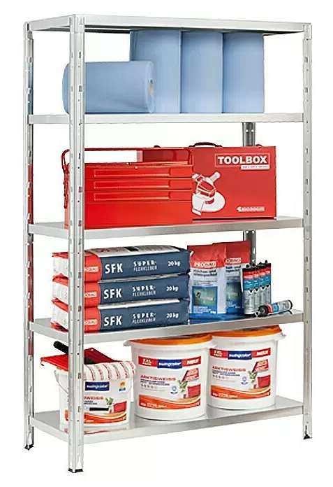 Bezšroubový policový díl má 5 kovových polic, z nichž každá může být naplněna až 200 kg s rovnoměrným rozložením hmotnosti. Vysoká kvalita a vysoká stabilita zajišťují dlouhou životnost a bezpečnost. Odolná police tak nabízí profesionální úložný prostor na vysoké úrovni.