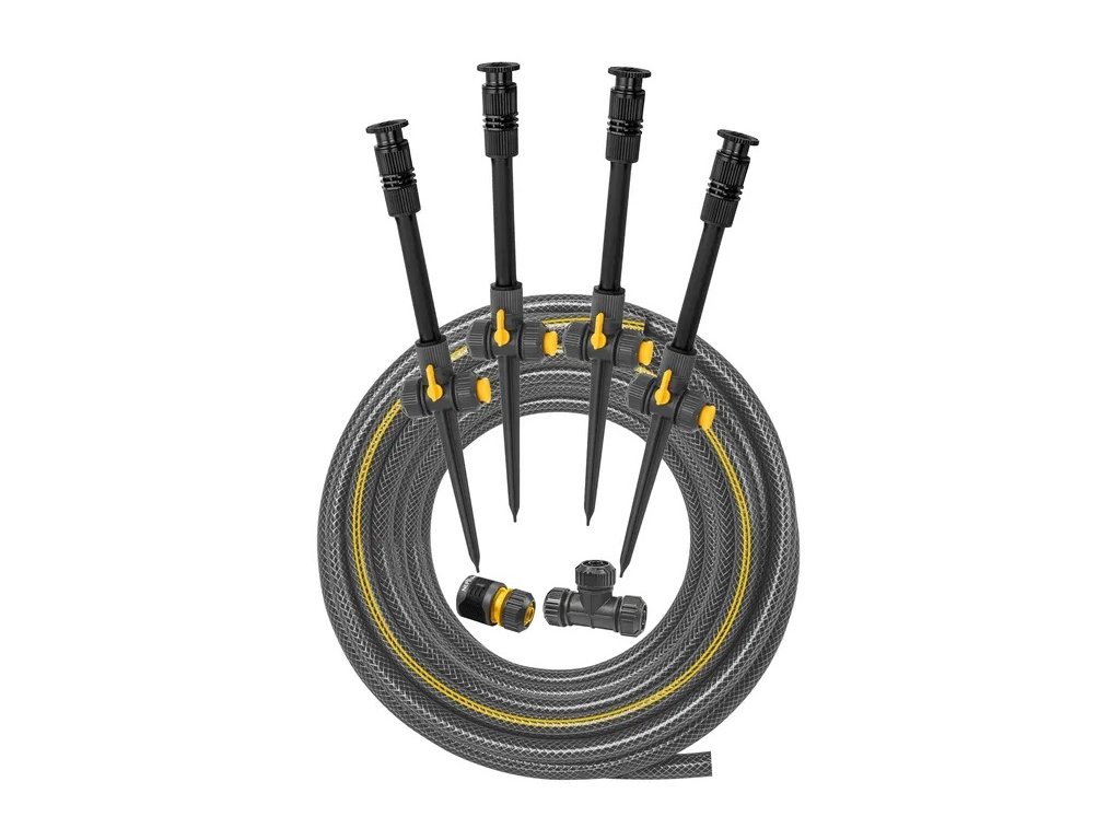 Kruhový zadešťovač od značky Neptun je ideální zejména pro zavlažování květinových záhonů do 78 m². V rámci 10 m dosahu můžete plynule nastavovat úhel zavlažování od 5˚ až do 360˚ bez použití nářadí. Díky pevnému hrotu se snadno instaluje do země. Sada obsahuje 4 kruhové zadešťovače, 1 hadici o délce 15 m a průměru 12,7 mm, 1 rychlospojku a 1 hadicovou spojku T-kus pro propojení hadic. Všechny komponenty do sebe zapadají a bezproblémovému zavlažování vašeho záhonu tak nic nebrání.
